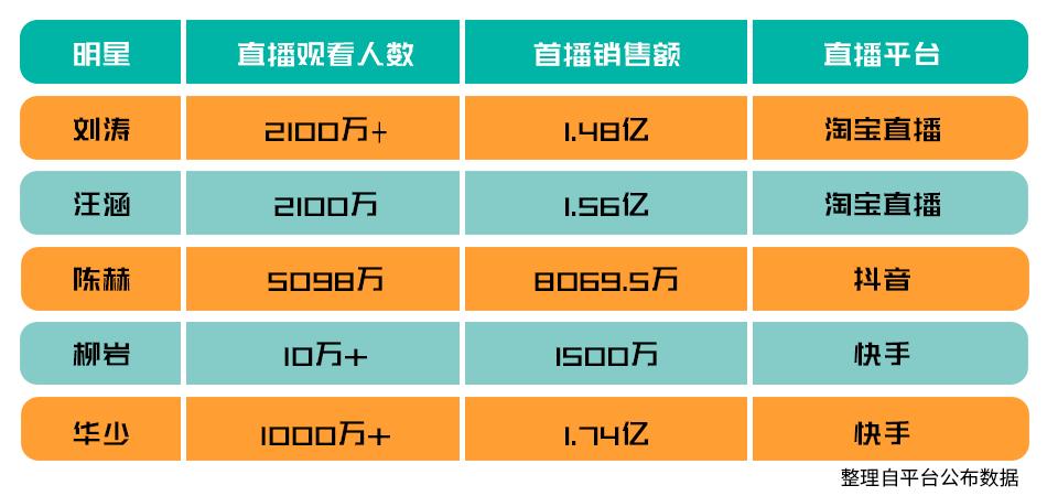 尽管汪涵在直播前没有任何社交媒体帐号,宣传造势难以下手,只是在但架不住演艺圈和娱乐圈的各路人马助力,首场直播4个小时2000万网友观看,成交额达1.56亿元,一时刷新明星带货记录。