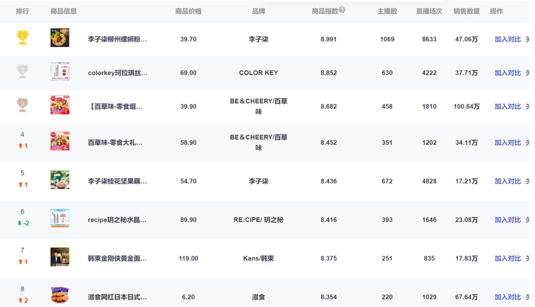 直播数据一直在变动,但是可以看到的是,位居榜单前十的产品总少不了食物以及美妆类。
