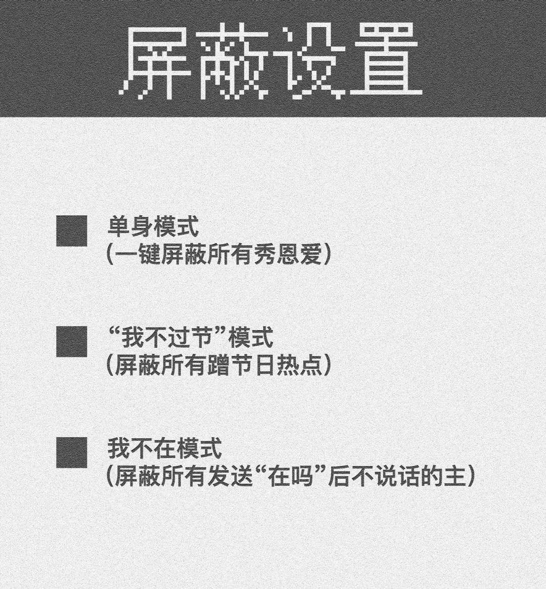 除了一键屏蔽自定义关键词,还可以开发一些定向屏蔽功能,比如怕虫子的就屏蔽所有虫子类科普,烦带货软广的就屏蔽所有种草贴。甚至在某些时间节点上还能自定义内容,比如推出“单身模式”,一键屏蔽所有秀恩爱;或者“我不过节”模式,屏蔽所有蹭节日热点的内容。