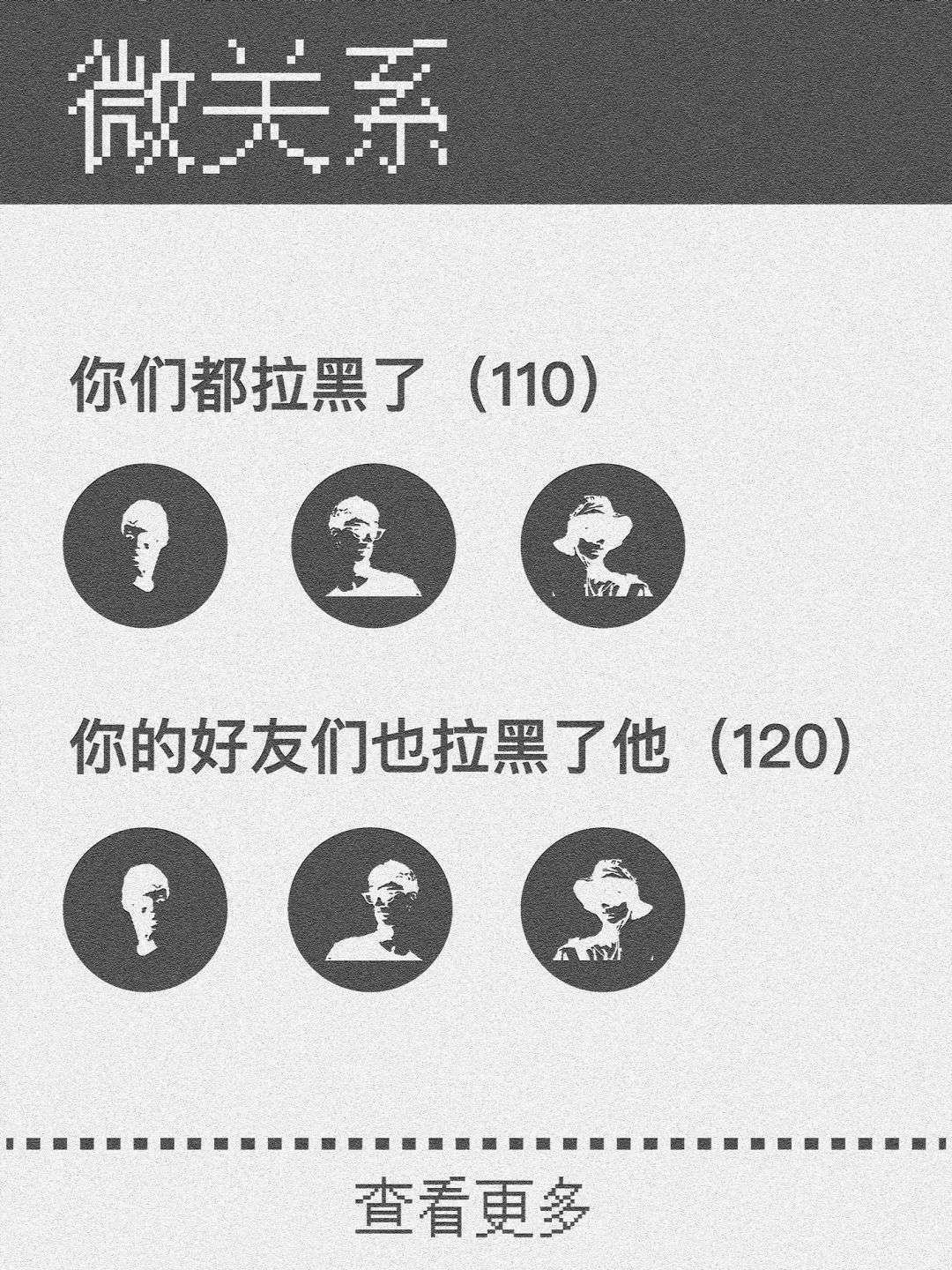 再弄一个“反向猜你喜欢”,告诉你“你跟某用户之间的拉黑名单有90%相似性/与您黑名单接近的用户有这些人/还有这些用户拉黑了xxx”,跟这些人做朋友,一定比“你们都喜欢某某”的那种更合得来;