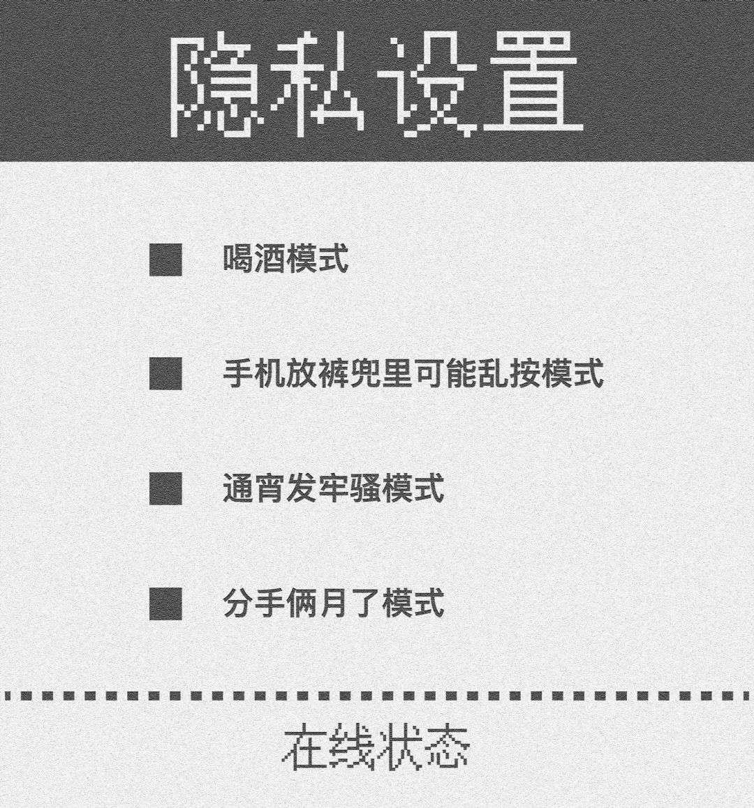 类似于游戏的免打扰模式,为了防止手滑和一些难以挽回的糟糕情况,自定义切换到某些社交功能来适用于不同场景,就显得格外有必要,类似于“喝酒模式(发啥都发不出去)”“手上抹油了/手机放裤兜里可能乱按模式(检测到乱码就不给发)”“通宵发牢骚模式(不管你发了什么傻兮兮的朋友圈,第二天早上都自动给你删了)”“分手俩月了模式(发任何东西之前都会提醒你,你真的要发吗发完别后悔哦)”。