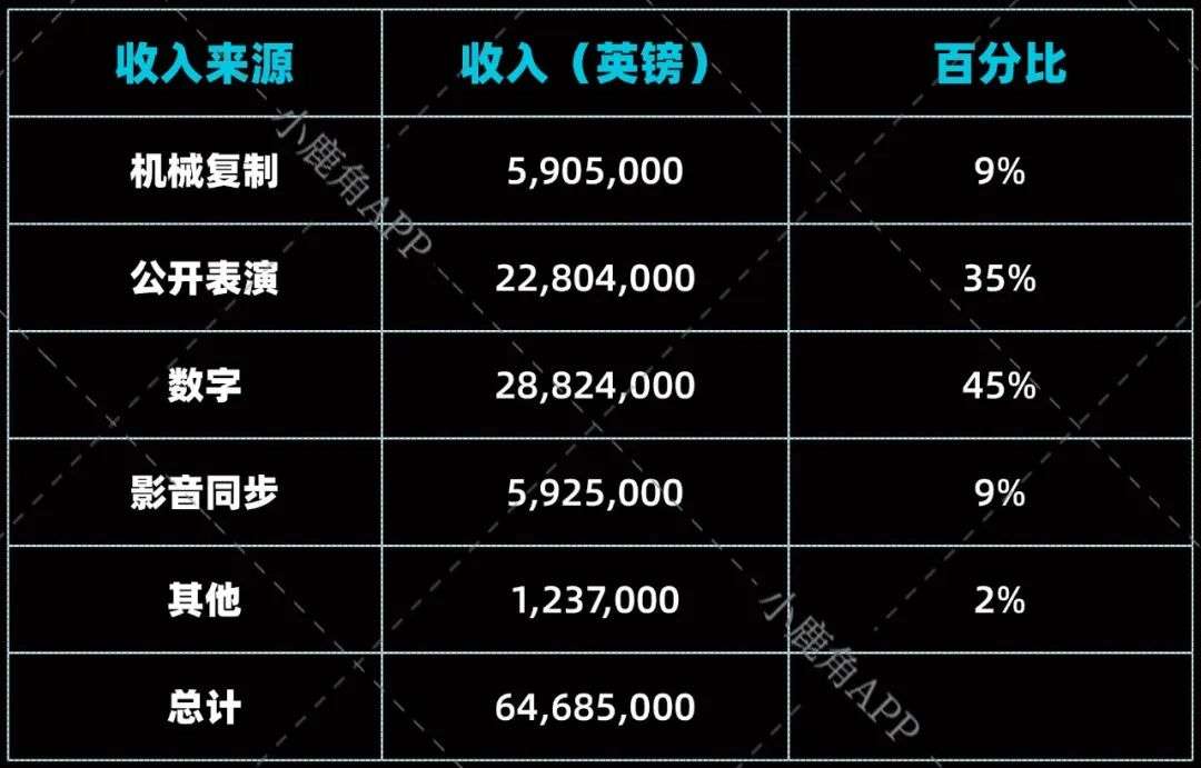 Hipgnosis对于投资组合的选择,侧面说明了个类型音乐在当下的变现能力。公司通过投资曲库的主要收益有4个来源——机械灌录复制版税、公开表演版税、数字以及影音同步授权许可版税。