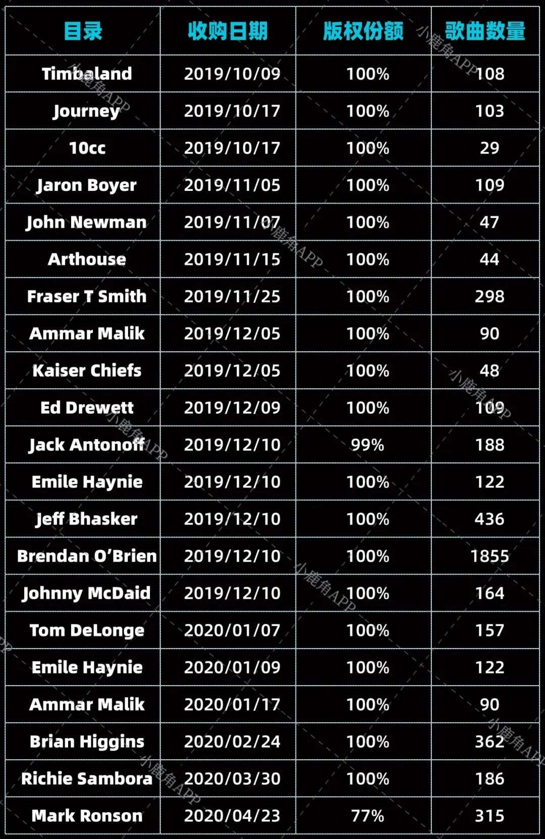 △ 2019.10-2020.4,Hipgnosis所收购版权,不完全统计