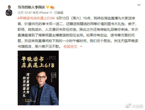 今天中午,李国庆微博宣布将在6月13日开直播,并且还将拍卖自己一小时的午餐时间,可以和他一起聊聊读书感悟、创业故事,起拍价1000元。截至发稿,拍卖价已达12255元。