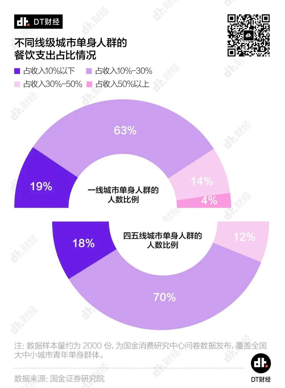 除了追求方便,独居青年还关注“吃得好”。50%以上的单身人群,会在餐饮消费上花掉收入的10%到30%,甚至还有18%的一线城市单身青年,会在吃饭上花掉30%以上的收入。