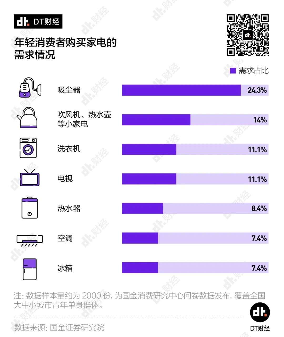 相对于空调、冰箱、热水器这样的大家电,年轻消费者购买吸尘器、吹风机、热水壶等小家电的意愿更强。
