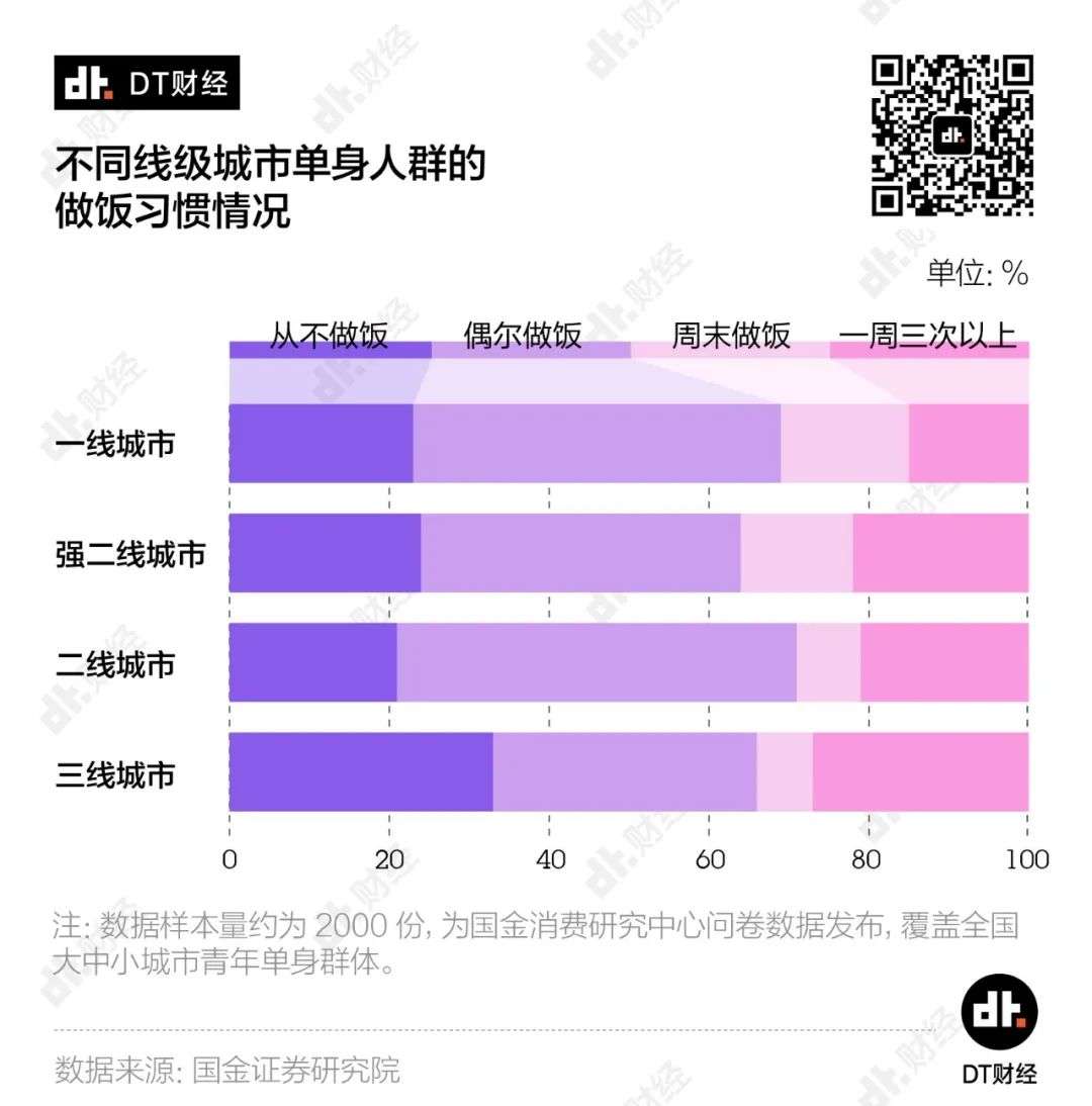 在各线级城市,独居青年们偶尔做饭和从不做饭的比例加在一起都在6成到7成之间。尽管在疫情期间,我们观赏到了年轻人的花式下厨大赛,但回到日常生活中,年轻人尤其是独居群体,更多将厨房视为供奉生活仪式感的场所。考虑到做饭耗费的时间精力,他们更愿意为外卖买单。