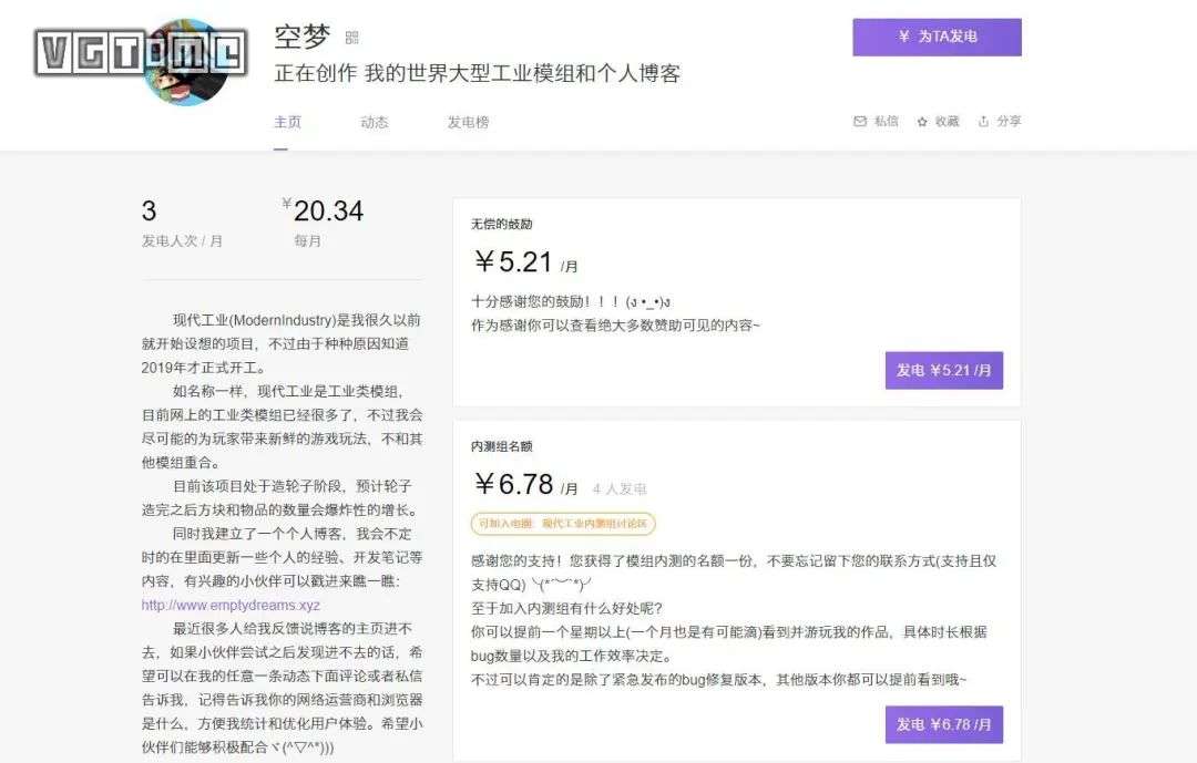 爱发电上一位《我的世界》模组作者的页面