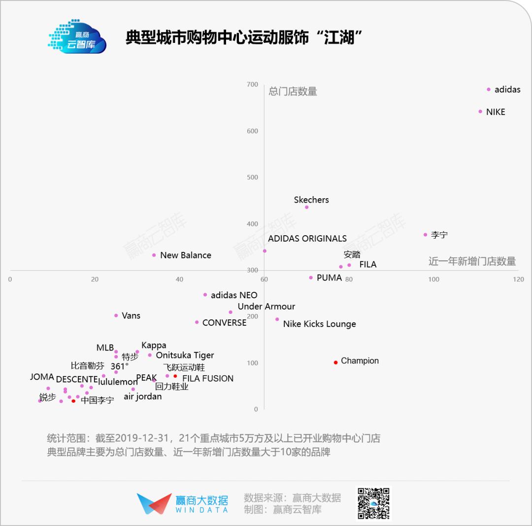 adidas、NIKE两大巨头分庭抗礼,总门店占有率近20%,新增门店数量同样遥遥领先,占据霸主地位。