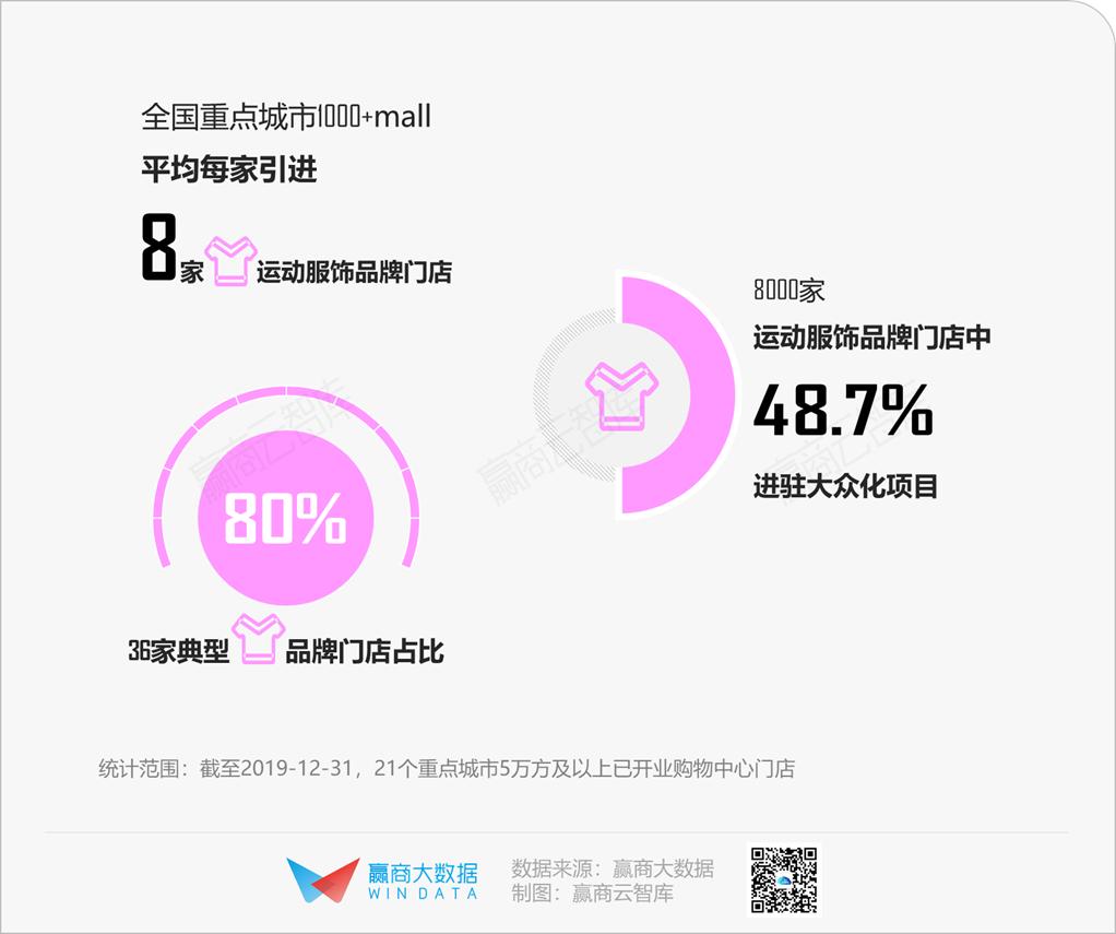 整体上看,全国重点城市1000多家典型购物中心,共计引进约8000家运动服饰品牌门店,平均每家购物中心引进8家店,近50%进驻大众化项目。