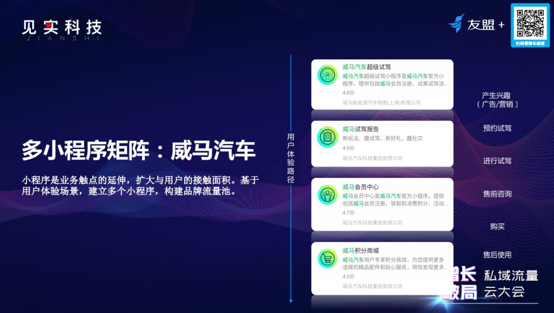 例如,威马汽车,他们将用户体验路径分拆为多个小程序,从整个品牌的投放、预约试驾、售后购买,售后使用等使用多个小程序组成矩阵,从多个场景进行引流,并从用户体验路径中观察用户在不同阶段的需求点和转化的效果。从而建立了威马汽车自有的品牌流量池,还培养了用户定期使用小程序的习惯。