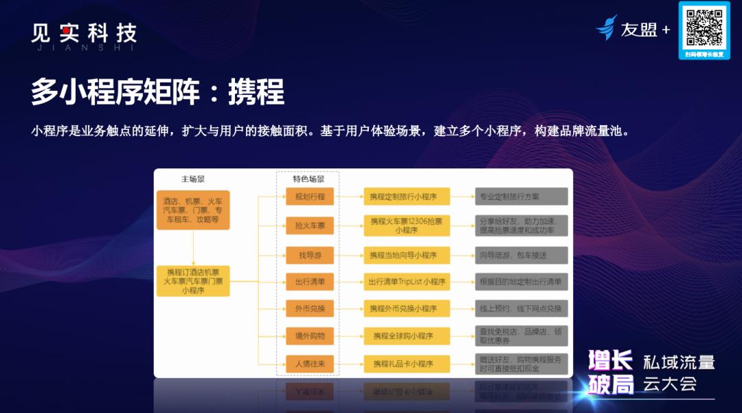 例如,携程在APP到小程序的转化过程中,并不是将APP原封不动照搬过来,而是将主场景和特色场景做了分拆,每个特色场景都独立建立小程序,并布局到不同平台中去。