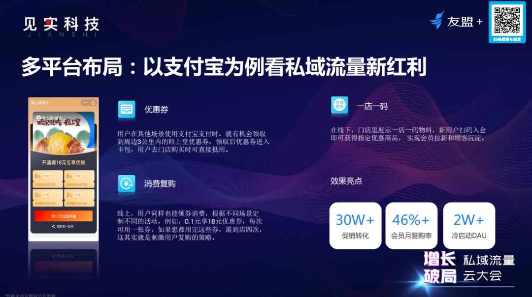 首先,支付宝有很强的支付属性,粒上皇用户在其他场景使用支付宝支付时,如在周边3公里内有粒上皇的线下店,就有机会在支付成功页面领取到粒上皇的优惠券,用户可以用来到附近门店或者线上消费抵扣。再结合蚂蚁会员体系,就能更好的拉动用户在线上和线下的消费复购。