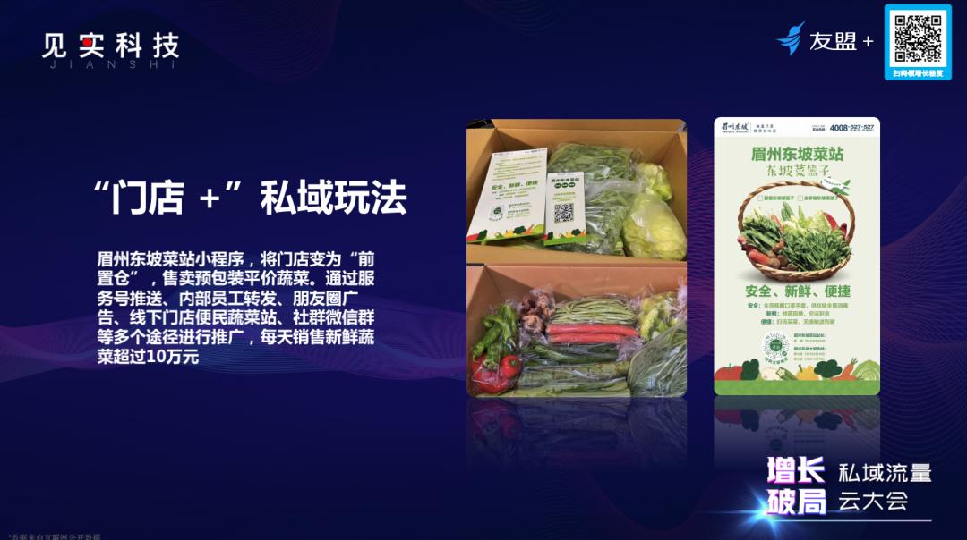 在利用小程序甩卖门店囤积蔬菜时,眉州东坡发现了一个线上+线下的新消费模式。通过“小程序展示半成品蔬菜+服务号分发”的私域玩法,打通了餐饮门店和线上互动的新销售模式,每天销售新鲜蔬菜超过10万元。