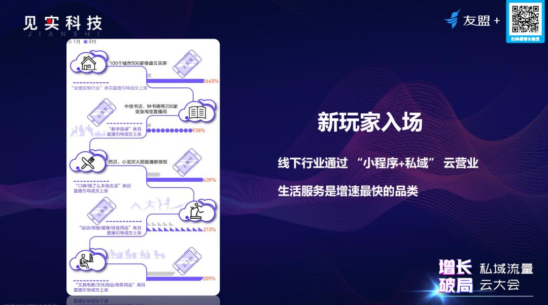 从1月和2月的行业数据来看,很多行业通过“小程序+私域流量”的玩法,将线下业务纷纷转移到了线上,包括:线上卖房、线上书店、新零售、云健身等。
