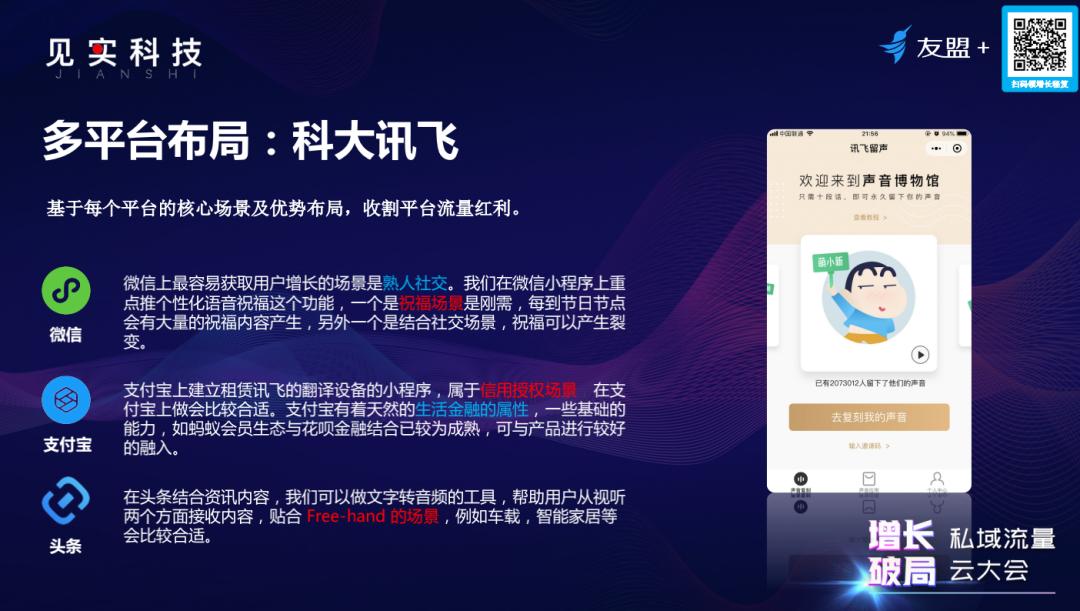 科大讯飞结合微信社交去中心化的属性,推出了适合祝福场景的个性化语音祝福功能,并结合社交场景做裂变;结合支付宝的生活金融属性推出适合信用授权场景的讯飞设备租赁业务;结合头条的资讯和工具应用属性推出了适合Free-hand场景的语音转文字服务,帮助用户从视听两方面接收信息。