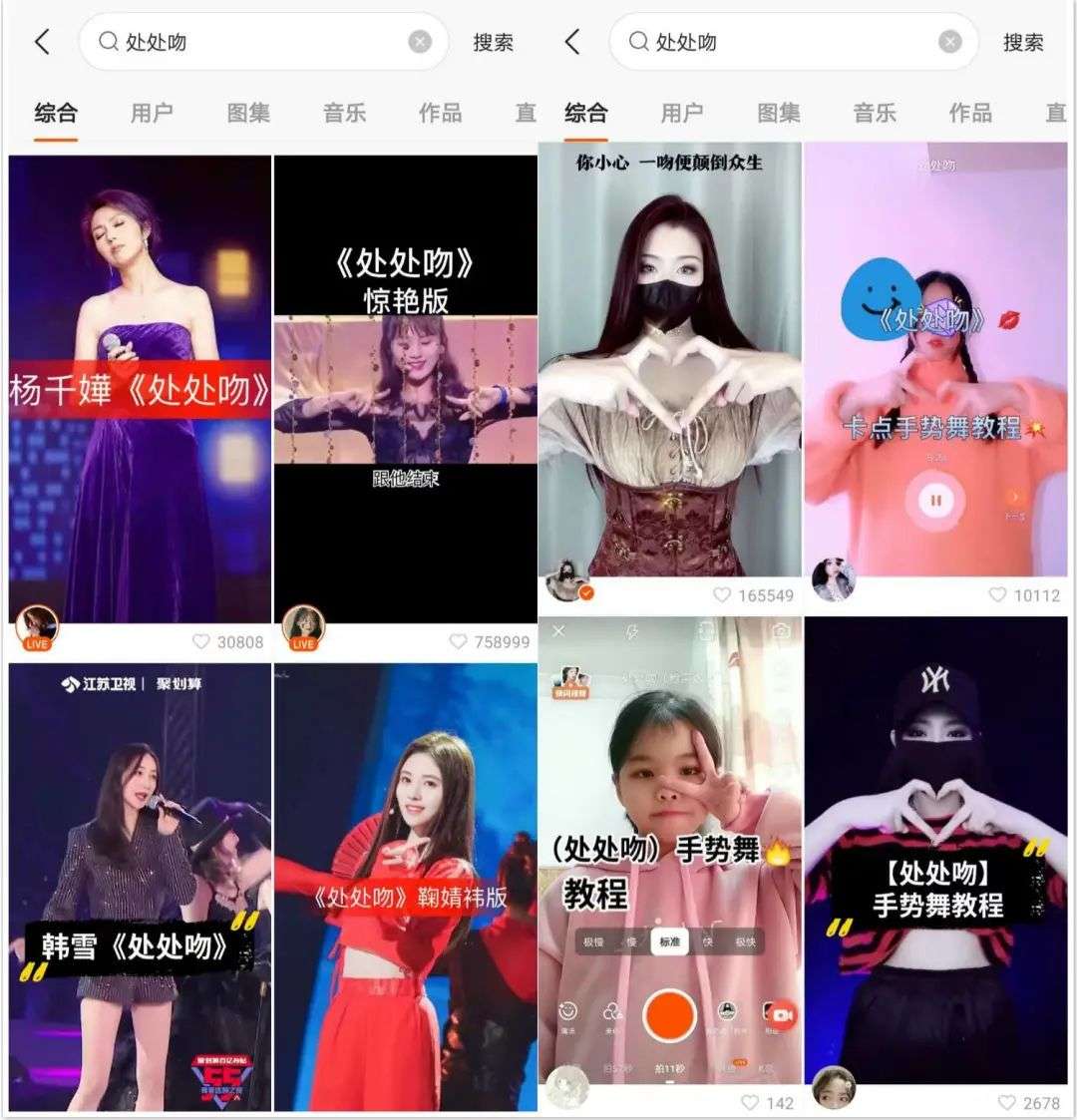 比如今年在在快手抖音翻红的粤语歌《处处吻》,其实是杨千嬅 2004 年的作品。经过网友的翻唱和改编后,还像《学猫叫》一样诞生了专属的手势舞,刷一遍短视频平台,你可能满脑子都是「一吻便偷一个心,一吻便杀一个人」。