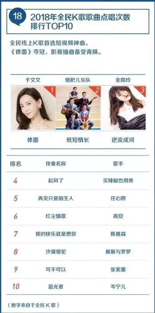 看看全民 K 歌上点唱次数最多的歌曲,已经是像《体面》《沙漠骆驼》和《纸短情长》这样的抖音神曲,这些歌曲都有朗朗上口容易传唱的特点,有人说「好唱」比「好听」更重要。