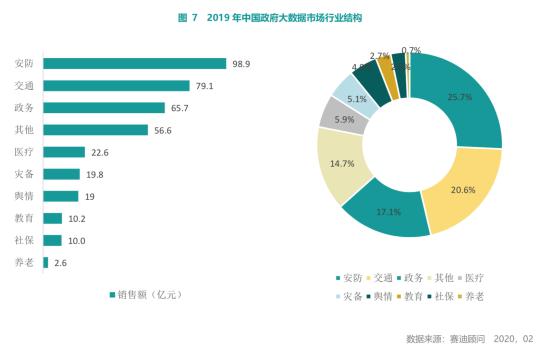 赛迪顾问与政务云市场研究报告一起发布的《2019-2020中国政府大数据市场研究报告》显示,2019年政府大数据增长率达31%,市场规模达384.5亿元,而大数据在社会治理(比如安防、交通等)、民生服务(比如医疗、教育、社保、养老等)、政务应用等领域的软件和应用所占据市场份额最多。