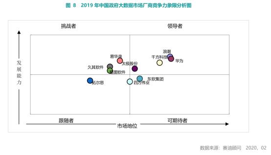 因而在政务云市场与涉及应用和服务的大数据市场的参与者有所差异,在大数据市场,浪潮、华为、千方科技为市场领导者。可以预见,全球服务器与云计算巨头浪潮与全球ICT巨头华为之间在政务云、大数据市场竞争将会更加激烈。