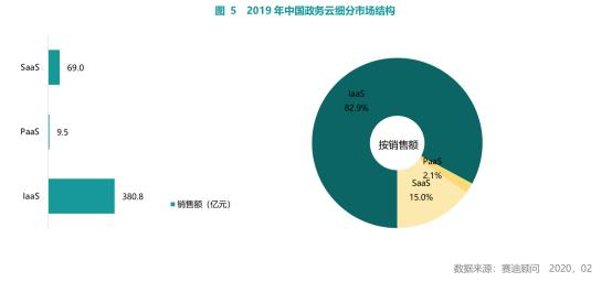 据赛迪顾问的报告显示,2019年全球政务云市场规模达到478.9亿美元,增速达13%,其中美国由于拥有微软、亚马逊、谷歌、CSRA、Cloudflare、Hashicorp等核心企业占据全球政务云市场的50.2%的市场份额;并且按销售额算,全球政务云市场市场产品结构分布也相对均衡,其中IaaS占据41.7%、PaaS占据15%、SaaS占据43.3%。