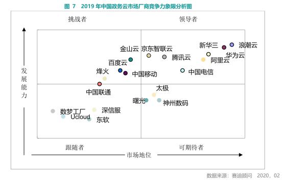 应该明确的是,帮助政府(组织)进行数字化升级,实际上是云服务巨头的to G市场,经过三年高速增长,国内政务云市场主要搭建者分别是浪潮云、华为云、阿里云、新华三属于市场领导者,阿里云、中国电信、腾讯云、京东智联云等紧随领导厂商。