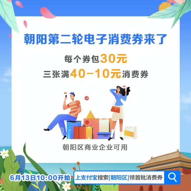 北京消费季期间,将有超过100亿消费券通过支付宝面向北京市民发放,其中就包括朝阳区1亿消费券、苏宁易购100亿消费券。朝阳首批5000万电子消费券分别于6月6日、13日、20日分三次发放,每个消费券包30元,由3张消费满40减10元消费券组成,全体在京人员可领,朝阳区域所有商业企业可用,优先支持朝阳区扶贫双创中心使用。
