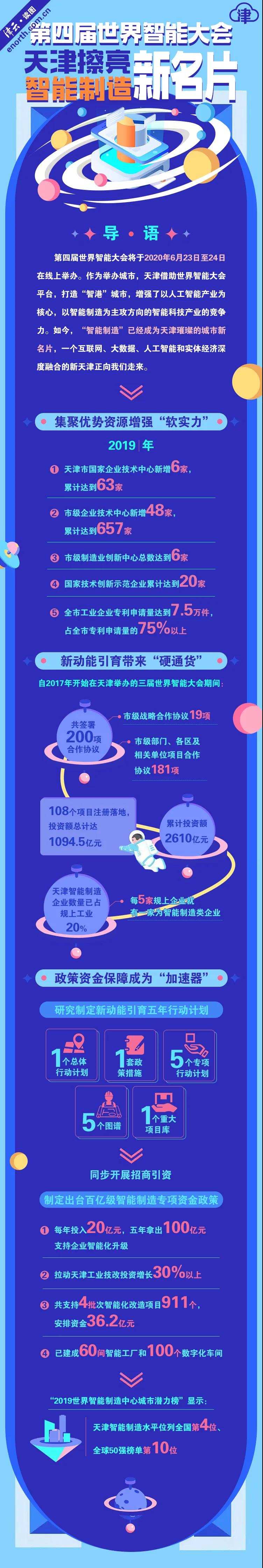 第四届世界智能大会将于2020年6月23日至24日在线上举办。作为举办城市,天津借助世界智能大会平台,打造“智港”城市,增强了以人工智能产业为核心,以智能制造为主攻方向的智能科技产业的竞争力。如今,“智能制造”已经成为天津璀璨的城市新名片,一个互联网、大数据、人工智能和实体经济深度融合的新天津正向我们走来。
