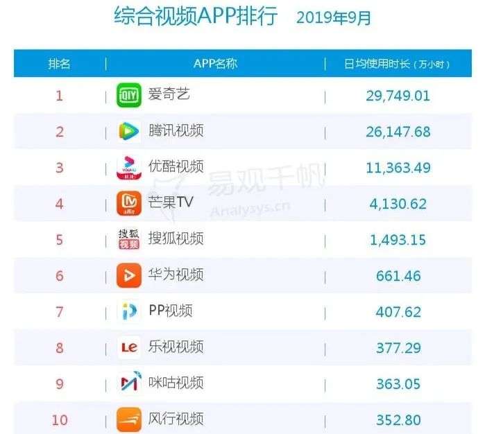 在日均使用时长上,2019年9月的数据显示,爱奇艺以日均使用时长29749万小时排在第一位,腾讯视频比爱奇艺少3000多万小时,而优酷视频仅有爱奇艺的约38%。