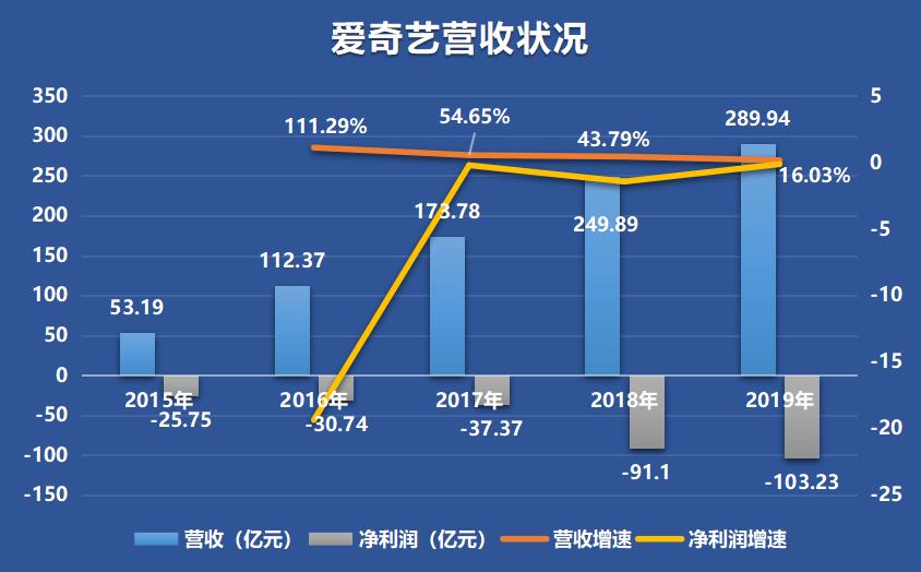 而爱奇艺2019年的营收就有289.94亿元,相应的亏损有103.23亿元。