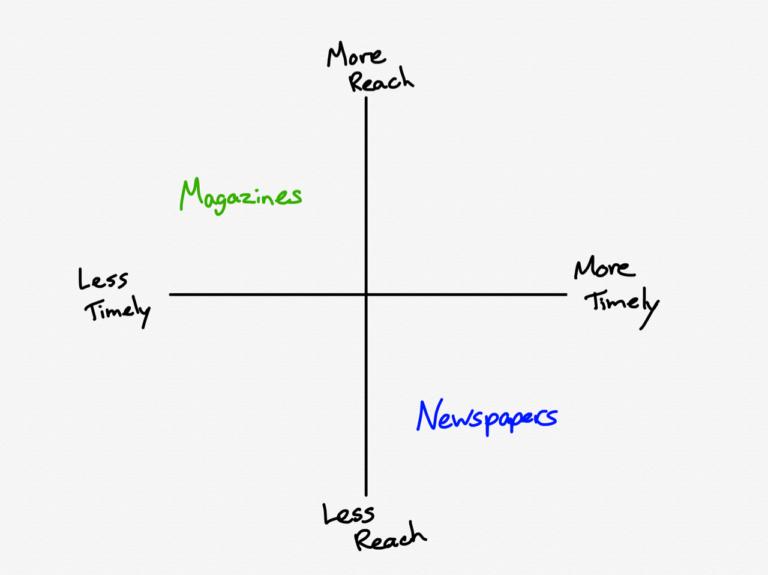 换句话说,市场机会是由时间和覆盖范围的交集来定义的。报纸需要及时,但覆盖范围有限,而期刊由于每周或每月发行一次,所以也可以拥有更大的覆盖面: