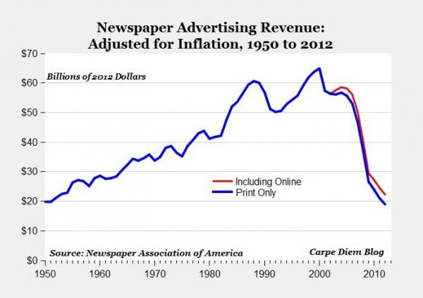 你几乎肯定看过这张图吧,关于报纸广告自第二次世界大战以来收入情况的图表: