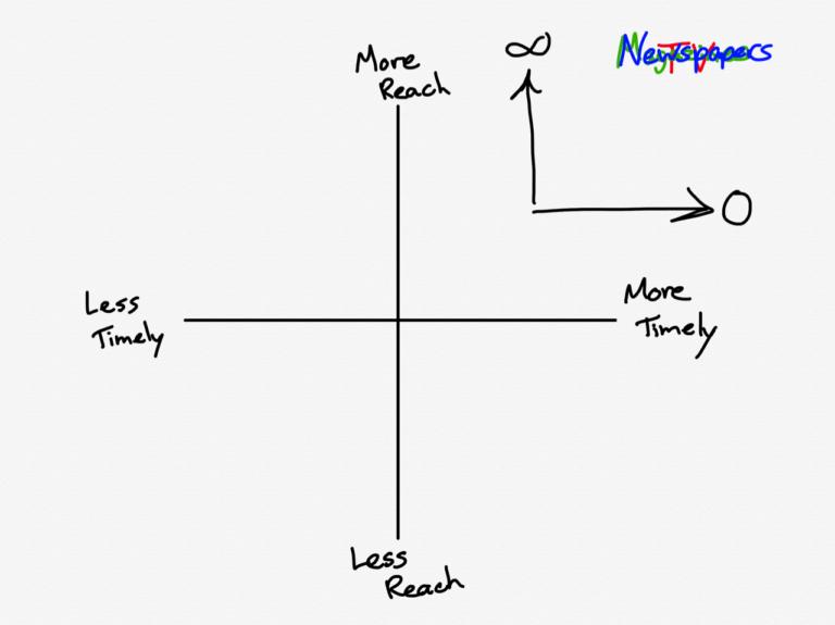 互联网以及在覆盖与时间之间的取舍也是如此:突然间,地球上的每一个媒体实体,无论大小,无论其选择的媒介如何,都可以立即到达任何人。换句话说,覆盖无穷远,而时间为零: