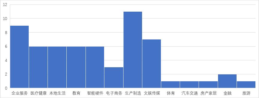 在赛道分布看,本周生产制造(11笔)、企业服务(9笔)和文娱传媒(7笔)的融资数量领先。
