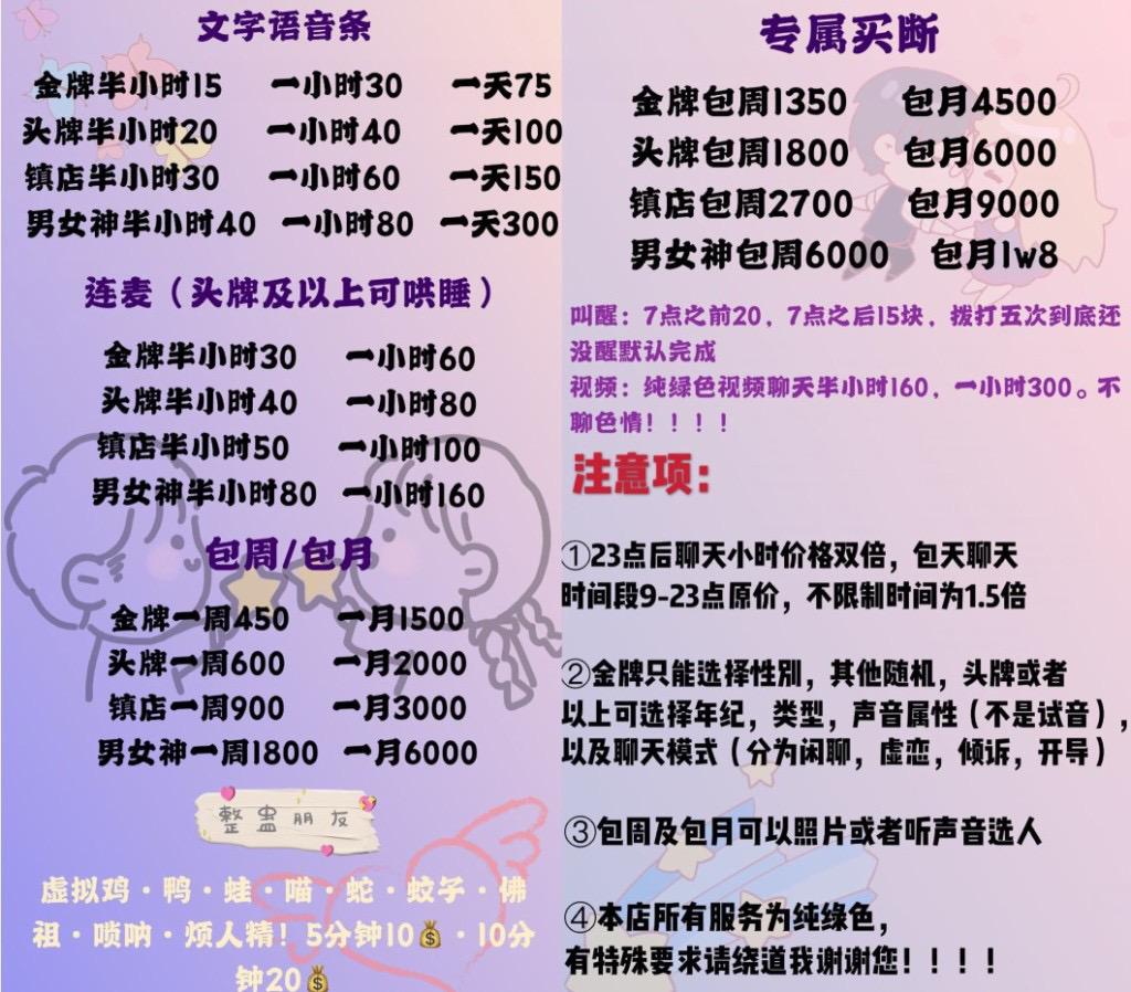 在小藏所在的店铺里,除了文字语音条、连麦、哄睡及绿色视频聊天服务,和其他贩卖虚拟社交服务的店家没什么差别,这里还提供包括虚拟鸡鸭蛙蚊子佛祖唢呐烦人精等消遣式服务,服务周期包括包周包月及专属买断。