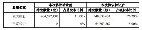 本次转让后,完美控股占公司总股本的26.29%,仍为公司控股股东。东富锐进持有公司股份64,663,867股,占公司总股本的5.00%。