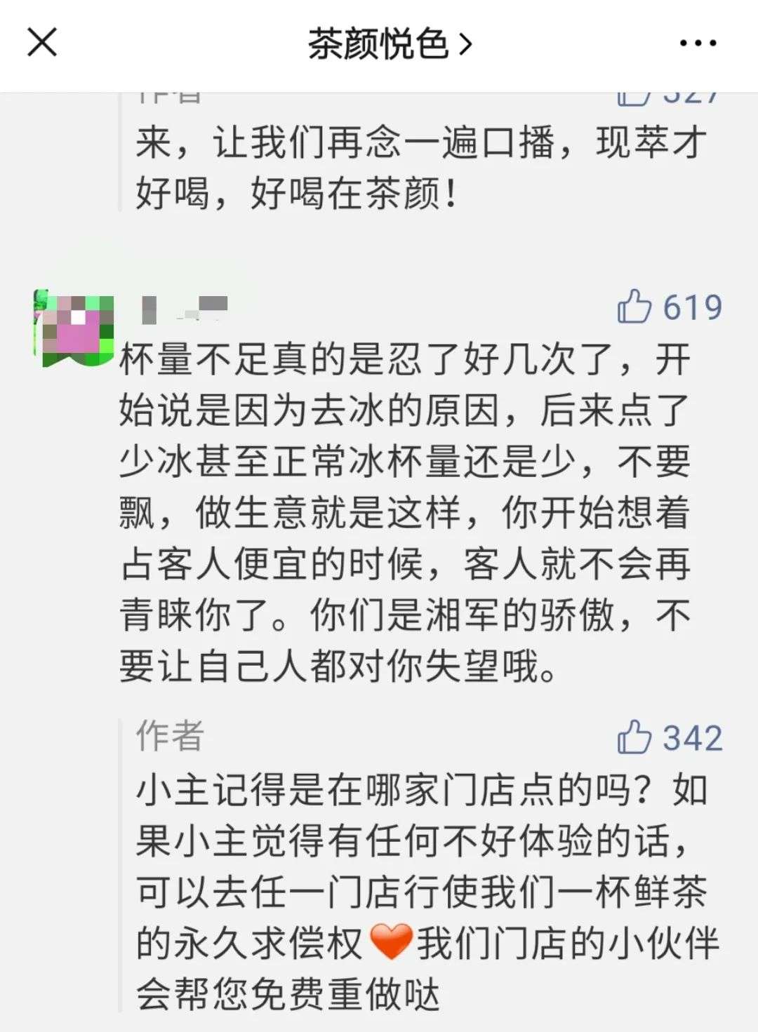 △茶颜悦色官方微信放出顾客的投诉反馈