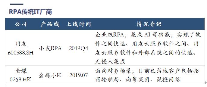 传统IT厂商出于渠道、客户资源协同,外加自身具备研发能力,会选择自研RPA 产品丰富供给。该类企业RPA产品仅小范围宣传,在已有客户池内进行推广。对于这类企业而言,RPA并不是其核心战略,仅作为其产品线补充或辅助。