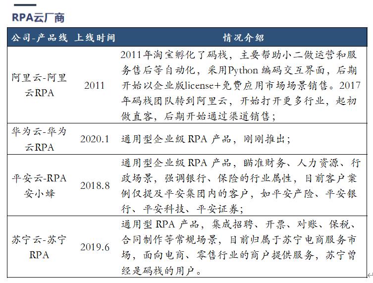 在阿里之后,华为云、平安云、苏宁云等云平台及产业云厂商纷纷布局RPA市场。云厂商的诉求是丰富产品线、拉动客户对云的使用量、提升整体收入规模。对于行业云来说,对业务的理解让他们的RPA产品在特定行业更具吸引力。