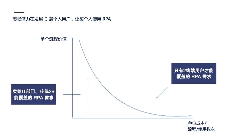 我们把共性的需求变成流程后,因为使用的次数多,平摊后的单位成本实际上是很低的。但对于非共性的需求,可能会对个体产生极大的价值,但因为使用次数少,如果花费过高的价格去制作这些流程,平摊后的单位成本还是过高。在2B的RPA 模式下,这些需求永远不会被满足。