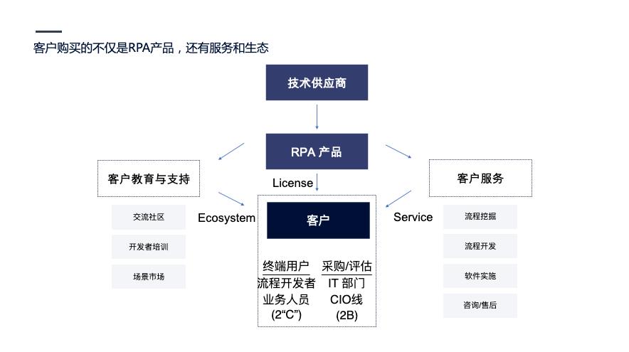 从企业客户的角度来看,采购RPA产品并不是购买商品这么简单。在选择供应商时,企业除了产品本身的使用权外,还需要强大的客户服务(Service)和客户教育与支持(Ecosystem)来支撑企业长远的使用产品。