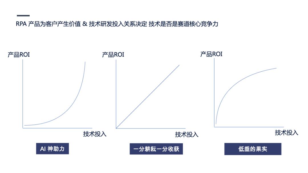 所有的AI论述都需要回归到价值本身,RPA企业都需要思考,AI的研发投入能给客户带来的产品ROI最终结果会是怎样的? 这个曲线有三种可能性,每一家RPA企业对此这条曲线的判断决定了公司与技术的关系,和对应成本结构是Capex还是Opex。这三种曲线是: