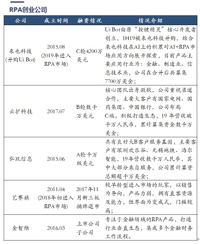 RPA行业中,2019年获得大量资本关注的三家创业公司为来也科技、云扩科技、和弘玑信息。其中,来也科技通过并购Ui Bot奥森科技进入市场。除了2019年切入市场的创业公司之外,原有RPA服务商包括艺赛旗、金智维等企业。