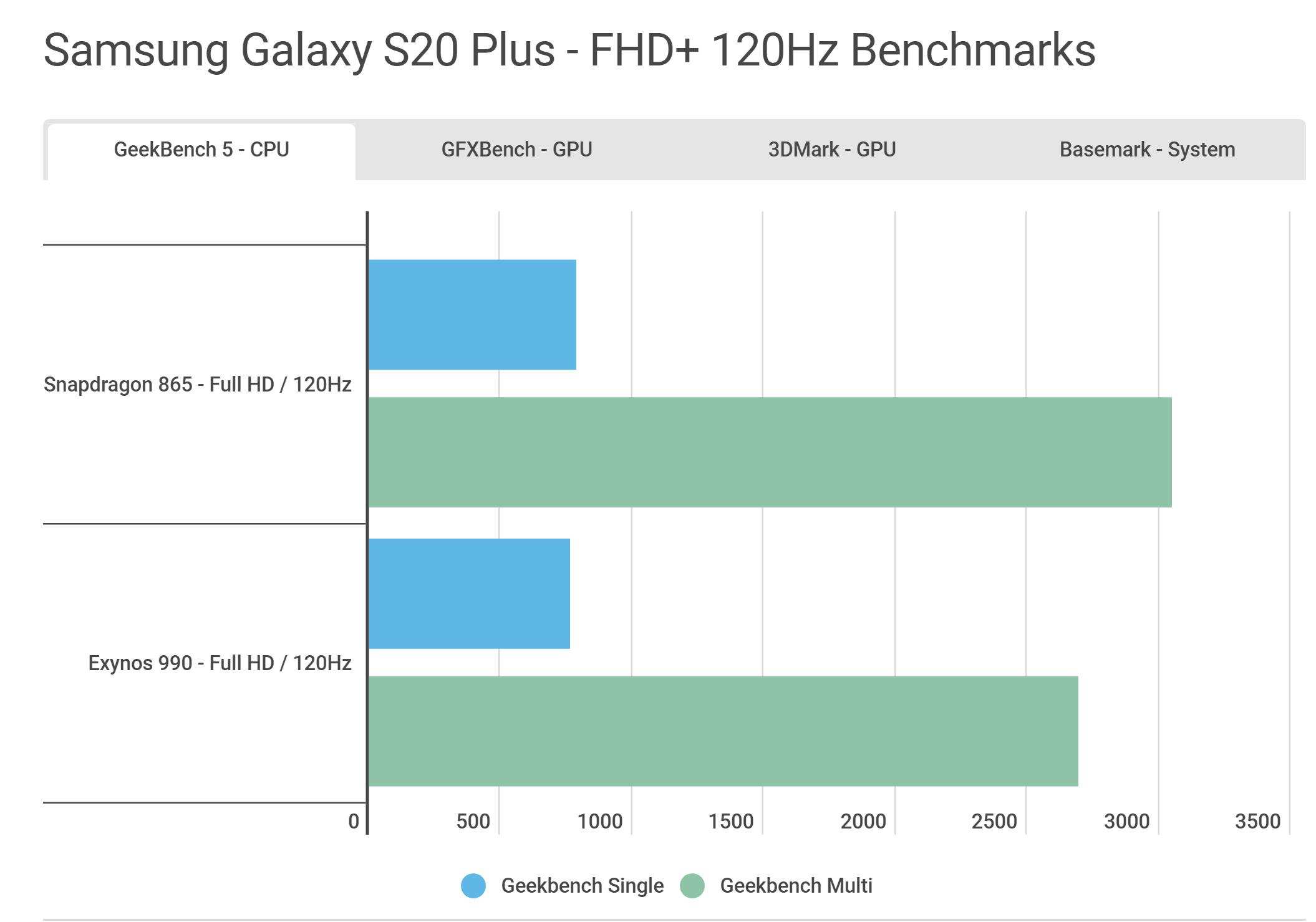 例如在 FHD+ 分辨率、刷新率为 60Hz 的配置下,无论是单核还是多核,骁龙 865 在 CPU 方面的成绩都优于 Exynos 990;GPU 方面,Exynos 990 落后骁龙 865 近 50%;系统性能方面,骁龙 865 也更胜一筹。