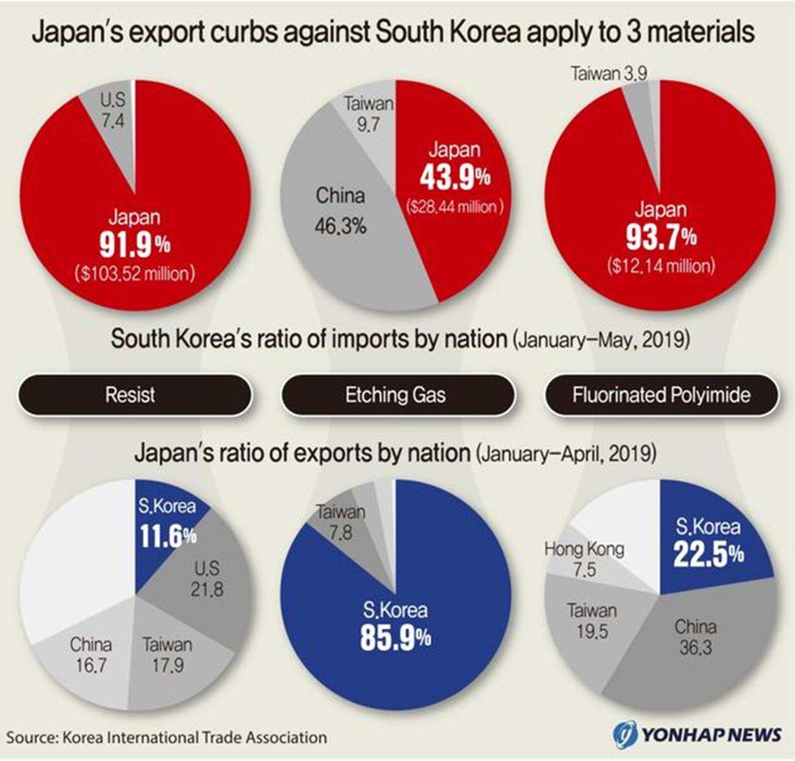除了芯片制造设备,半导体材料对于芯片产业的重要性也是不言而喻。所以如果三星杂在这个领域牛X的话,也会在某种程度上让其建立非美系设备芯片制造厂时,具备与美国博弈的筹码。但不幸的是,在这个关键领域,去年爆发的日韩贸易战又让三星暴露出在芯片产业链中的又一致命短板。