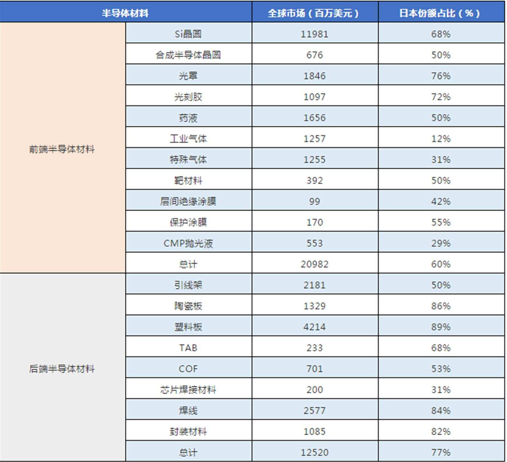 通过此次贸易战,业内知道,日本竟然是全球最大的半导体材料生产国,并在半导体材料里长期保持绝对优势,生产半导体芯片需要19种左右的必须的材料,缺一不可,且大多数材料具备极高的技术壁垒。其中日本企业在硅晶圆、合成半导体晶圆、光罩、光刻胶、靶材料、保护涂膜、引线架、陶瓷板、塑料板、TAB(捲带式自动接合)、COF(薄膜复晶)、焊线、封装材料等14种重要材料方面均占有50%以上的份额。