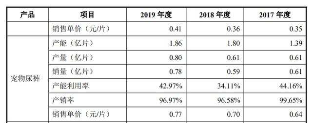 2017-2019年,公司宠物尿裤的产能分别为1.39亿片、1.8亿片、1.86亿片,产量分别为0.61亿片、0.61亿片、0.8亿片,产能利用率只有44.16%、34.11%和42.97%,尚不足一半。