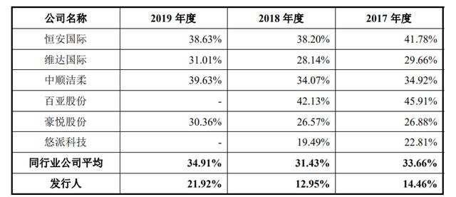 报告期内,依依股份和同行业公司中以生产销售个人卫生用品的恒安国际、维达国际、中顺等相比,毛利率相差10多个百分点,距离毛利率最高的中顺洁柔差距为17.71%;和同样以宠物一次性卫生护理用品生产销售为主的优派科技相比,依依股份毛利率依然逊色的。