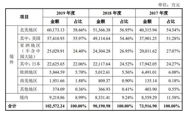 从营收结构来看,宠物卫生护理用品是其支柱业务,2017-2019年收入为6.56亿元、8.15亿元、9.32亿元,占当期主营业务收入比例达88.69%、90.31%、90.83%;按区域划分,又以海外市场为主要销售来源,报告期内来自北美、欧洲、南美、亚洲等国家的收入达6.54亿元、8.19亿元、9.34亿元,占当期主营业务收入的比例为88.42%、90.76%、91.01%,境内收入只占11.58%、9.24%、8.99%,且营收额连续3年几乎没有增长。