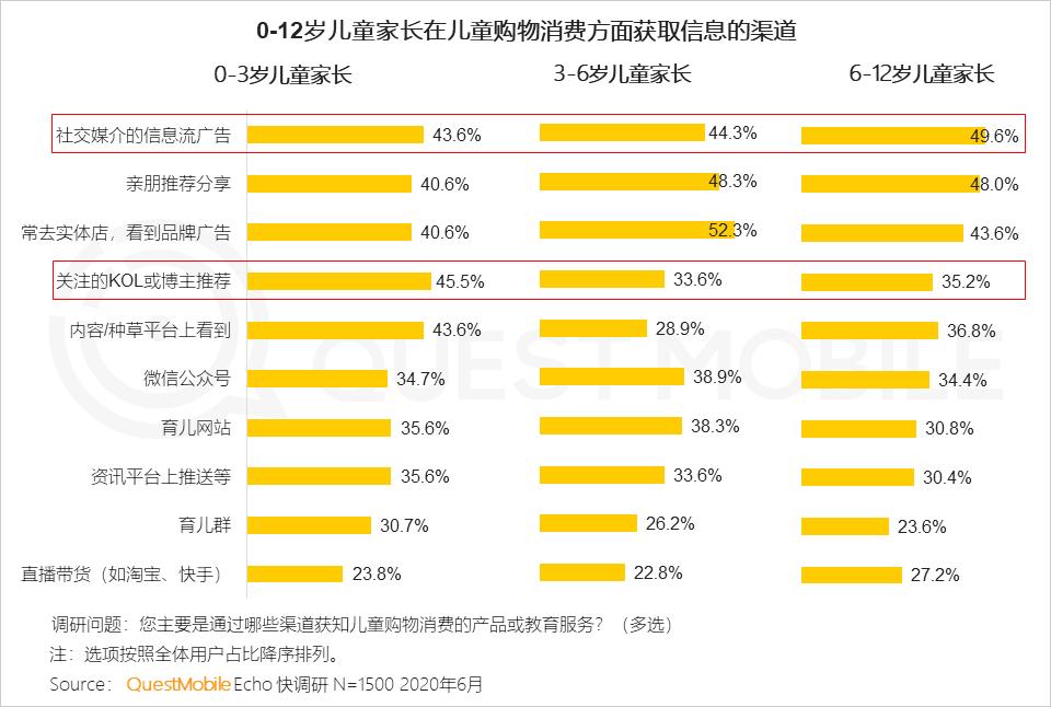 此外,信息渠道多元、便捷,社交分享、内容种草、KOL带货等等,正在利用家长育儿焦虑,形成一个“儿童经济细分领域”的闭环:接触(内容、社交、垂直、KOL)——评估(教育观念+家长特性)——消费(电商、KOL、品牌性价比),相比以前,社交媒介、亲朋推荐分享,在0-12岁儿童家长信息获取上,都占据了非常高的比例……